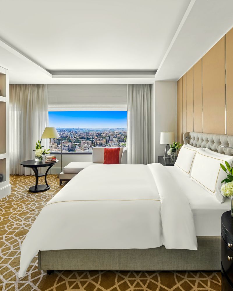 Royal Amman Suite with king bed and panoramic city skyline views, featuring a luxurious living room, dining area, private workspace, and exclusive Fairmont Gold Lounge access, along with complimentary access to the spa’s facilities.